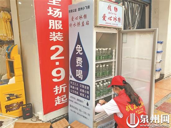 昨天下午,在浦西路59号三年七班服装店门口,泉州小飞侠志愿服务队的志愿者给店门口的爱心冰柜补充了一批矿泉水。队长王燕云介绍,这台爱心冰柜由他们团队管理,这也是他们第二年参与“爱心冰柜免费奉水”活动,目前,小飞侠已采购1005箱矿泉水准备送出。