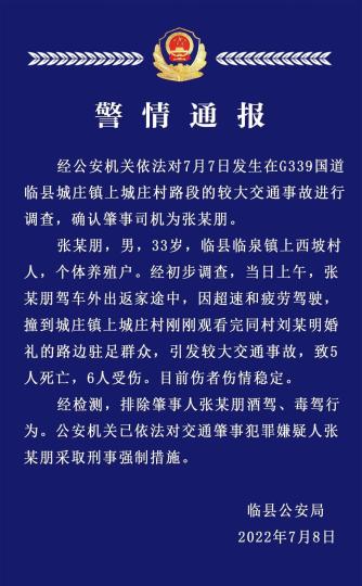 张某朋,男,33岁,临县临泉镇上西坡村人,个体养殖户。经初步调查,当日上午,张某朋驾车外出返家途中,因超速和疲劳驾驶,撞到城庄镇上城庄村刚刚观看完同村刘某明婚礼的路边驻足群众,引发较大交通事故,致5人死亡,6人受伤。目前伤者伤情稳定。