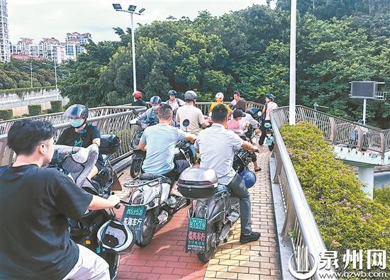 在上下班高峰期,天桥上常出现电动车拥堵场景。