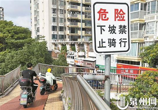 此外,天桥上也设有提示牌,提醒市民下坡禁止骑行。但是记者看到,大多数电动车驾驶人都是骑行上下坡,有的电动车甚至载着人上下天桥。