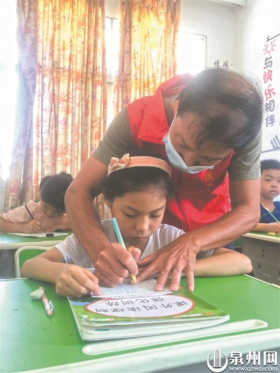 “走之底笔顺是点、横折折撇、捺,三笔写成,捺是平捺,不要写得太斜……”在隔壁二年级教室里,安溪义工协会志愿者郑重阳正在给孩子们讲解“走之底”的写法。郑重阳是安溪义工协会金谷服务队秘书长,也是中国硬笔书法协会会员,这次暑期班他主动担任书法老师。