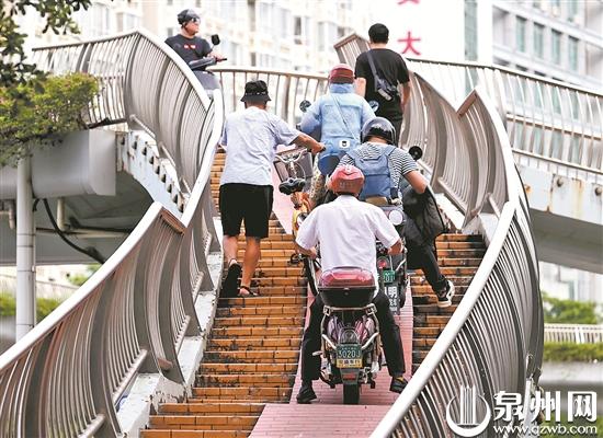 与赖女士有同样烦恼的还有陈先生,他每天从城东骑电动车载小孩到市区上学,每次早高峰路过天桥,都要等上一会。“不仅是上下桥的通道过窄,桥面上的砖也非常滑,一到雨天,经常有人摔倒。”陈先生说。
