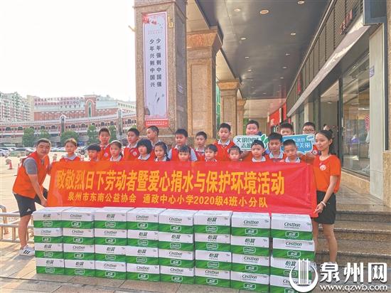 16日下午,东南公益在泉州商城广场举行“爱心冰柜免费奉水”公益行动,通政中心小学2020级4班24名同学主动捐出零花钱,采购160箱矿泉水参与活动。当天下午,同学们走上街头,为一线的高温工作者送清凉。在活动中,孩子们还随手捡起地上的垃圾,共护市容环境。