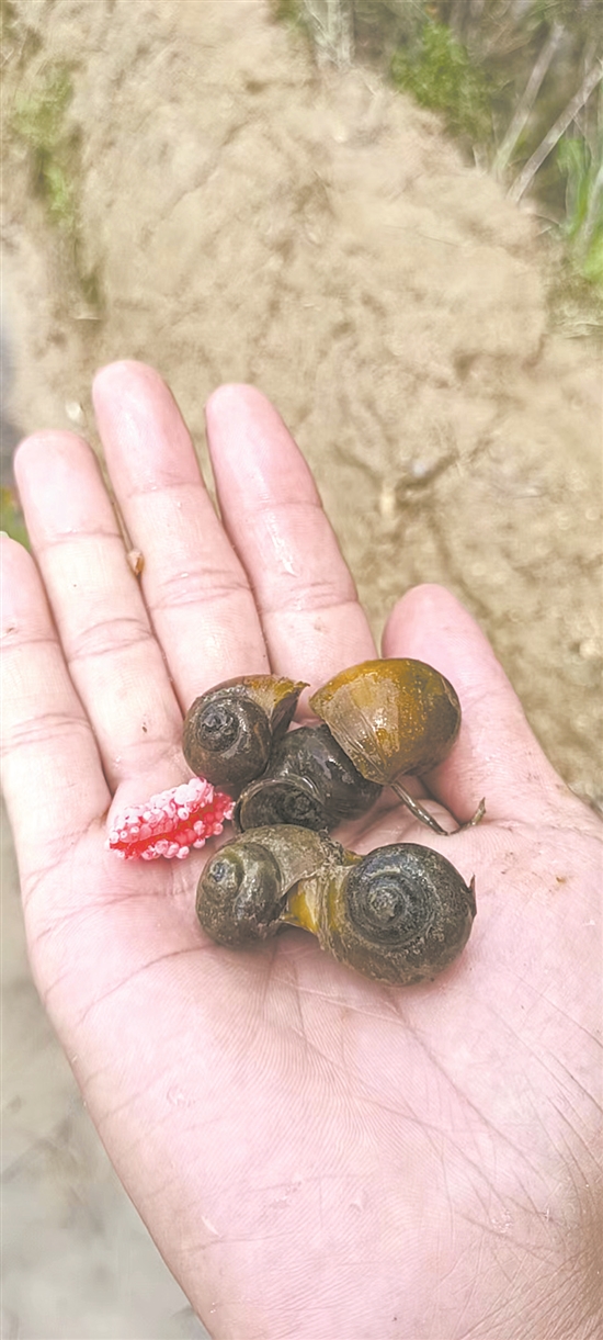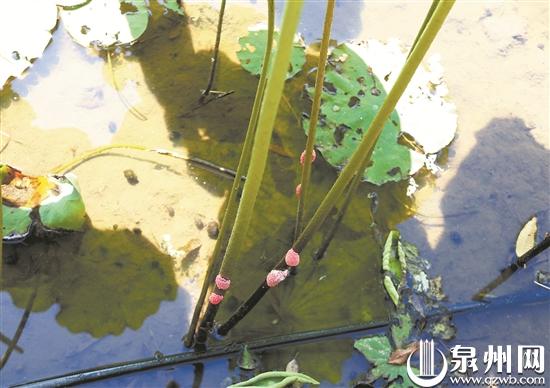 云龙谷荷花池有不少福寿螺和螺卵(陈明华 摄)