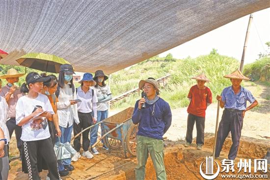 走进尚卿乡青阳下草埔冶铁遗址广场和展示馆,古冶铁场往昔的繁华仿佛重现在人们眼前。在安溪县博物馆馆长易曙峰的带领下,安溪县文化遗产保护小志愿者一行穿过一条由沙袋铺就的小道,来到位于梯田上的青阳下草埔冶铁遗址核心区域,聆听申遗故事。易曙峰介绍,整个遗址核心区域大约5000平方米,目前挖掘了约2300平方米。遗址不仅包括一处冶铁遗迹,还涵盖周边的古矿洞、古道,以及青阳余氏家族的祖屋遗址和一座为冶炼提供薪材的山地。