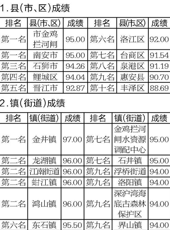 泉州网7月26日讯 (记者吴志明 通讯员邱一漫)6月份,市城市管理综合考评中心对全市海岸带(近岸海域和海岸线向陆一侧200米的陆域)和晋江河道(市区段晋江入海口至金鸡拦河闸上游100米)的环境卫生情况进行考评。其中,在各县(市、区)成绩中,市金鸡拦河闸、南安市并列第一名,丰泽区第十名。而从各镇(街道)成绩来看,金井镇第一名,浮桥街道、洛阳镇、深沪湾海底古森林保护区、界山镇并列第九名。(具体成绩详见下图)