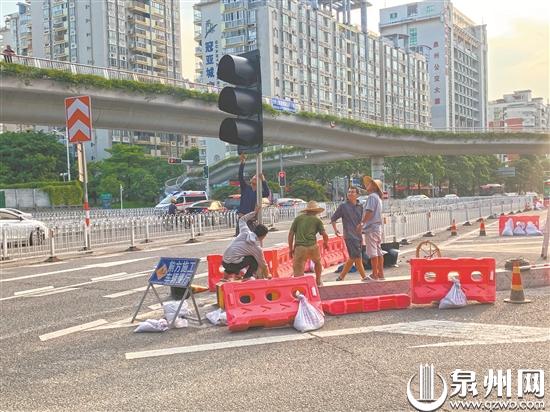 上午,记者来到大坪山隧道西洞口的人行天桥。天桥下渠化岛内的花草苗木已经全部移走,渠化岛完成水泥硬化。在施工现场,几名工作人员正在忙碌,准备在新增设的行人和非机动车混行通道安装灯控。下午5点左右,记者再次来到现场,靠近丰泽街一侧的灯控设施已经安装完成,靠近大坪山隧道一侧的灯控设施也在安装当中。现场工作人员告诉记者,16日开始,他们就进行线路预埋,25日所有灯控设备完成安装,但使用前还需要进行亮灯调试。