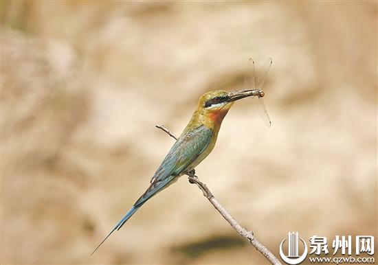 成鸟叼着蜻蜓准备喂养雏鸟(肖书平 摄)