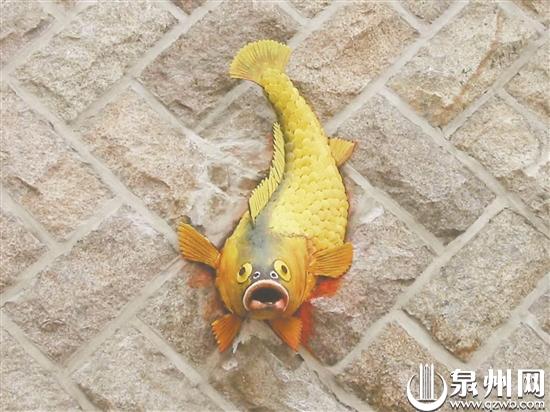 堆剪工艺大师吕文金通过剪瓷技艺,在建筑上创作出鱼形状的滴水兽作品,寓意年年有余。