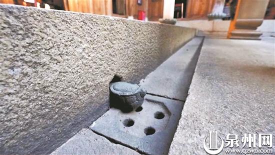 天井,又称深井,是闽南传统建筑中极为重要的建筑空间。一般面积不大,呈方形或长方形,具有采光、通风及排水等作用。人们会在天井中开挖一条阴沟暗涵,使水曲折流出。整条水沟分涵孔、涵井和涵口三部分。涵孔的位置按本村的水势流向而定,或按房屋所属五行属性确定方位,由石匠凿于榉头砛石的底边。天井内的雨水,则经由涵孔进入暗渠,再排放至屋外。“水沟堵,是用来堵塞涵孔的器物。平时可以防止泥沙堵塞。到了下雨的时候就把它拿出来,水就会通过这里面排出去。”