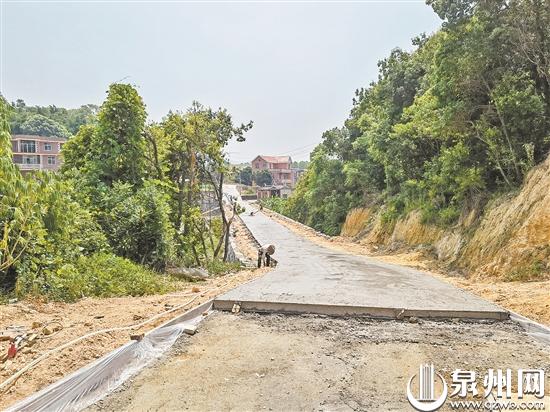 昨日上午10时许,记者来到南安梅山镇灯光村杏村路的施工现场,一条从灯光村村委会延伸至杏落自然村的道路十分笔直,挡路墙、素土层已基本完成施工,多名施工人员顶着烈日正在对路面进行水泥硬化。