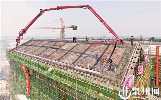 近日,石狮水头排涝枢纽工程主泵房顺利封顶。石狮水头排涝枢纽工程是省级重点项目,是纳潮、挡潮、防洪、排涝等功能相结合的水利枢纽工程。该项目2020年6月开工,目前正有序推进。(李荣鑫 摄)