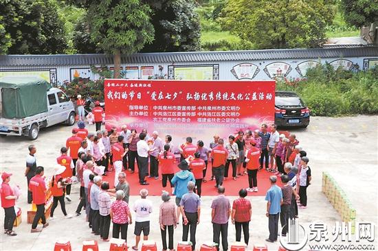 当天,市委宣传部、市委文明办、洛江区委宣传部、洛江区委文明办、农工党泉州市委会、泉州市泉城公益协会于洛江区罗溪镇广桥村开展了我们的节日·“爱在七夕”弘扬优秀传统文化公益活动,邀请31对金婚伉俪一起过七夕,并定制了31束玫瑰花,由阿伯送给阿婆表达爱意。
