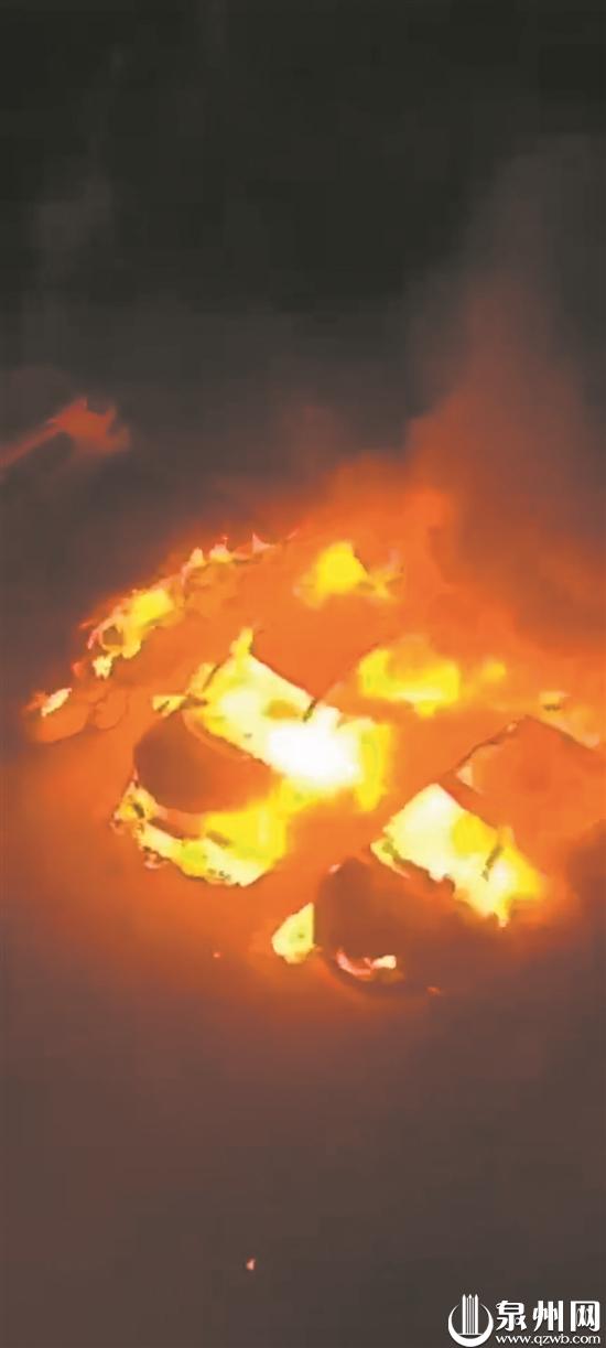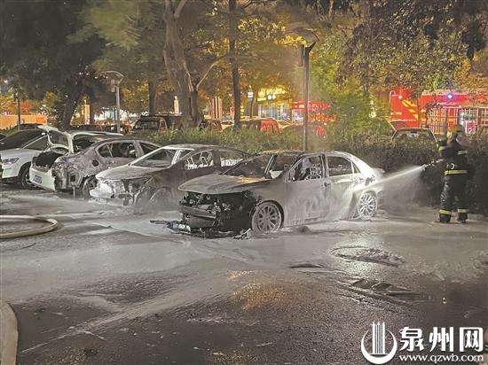 泉州网8月10日讯 (记者王丽虹 文/图)昨晚7时10分,市民吴先生拨打泉州晚报社24小时热线96339反映称,市区南环路四季康城小区一期停车场有一辆小车自燃,火势还殃及旁边另外两辆汽车。