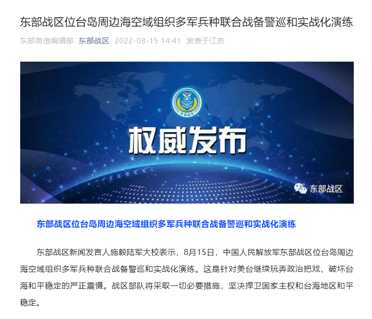 东部战区新闻发言人施毅陆军大校表示,8月15日,中国人民解放军东部战区位台岛周边海空域组织多军兵种联合战备警巡和实战化演练。这是针对美台继续玩弄政治把戏、破坏台海和平稳定的严正震慑。战区部队将采取一切必要措施,坚决捍卫国家主权和台海地区和平稳定。