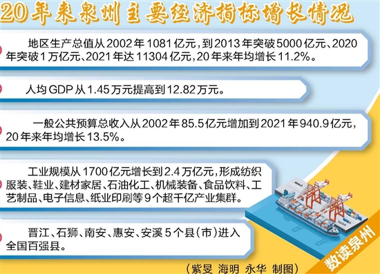 一以贯之地贯彻落实习近平总书记提出的“六个始终坚持”和“正确处理好五大关系”的科学理念和工作方法——20年来,得益于“晋江经验”的正确指引,福建省、泉州市、晋江市实施一系列创新举措、取得一项项喜人成绩,在经济发展、改革创新、城乡建设、文化传承、民生改善等领域实现新的重大跃升。透过数据看发展,20年来,福建省地区生产总值从2002年的4467.6亿元,增长到2021年的48810.4亿元;泉州市地区生产总值从2002年的1081亿元,增长到2021年的11304亿元;晋江市地区生产总值从2002年的277亿元增长至2021年的2986亿元。