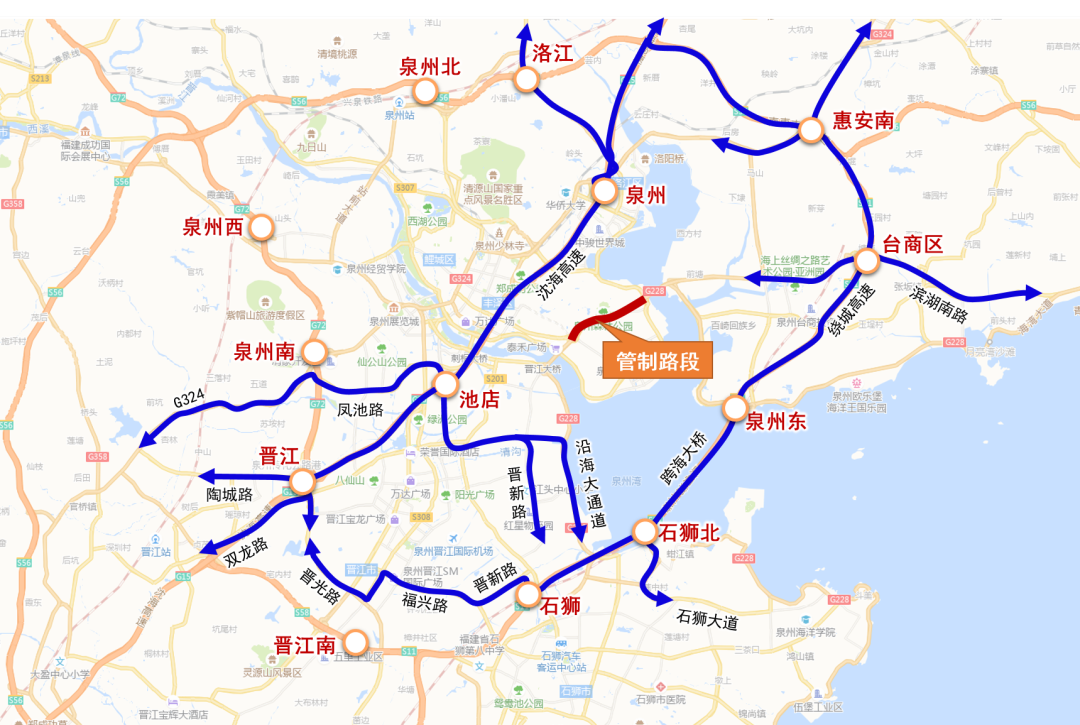 由惠安南、台商区、泉州东高速互通进入环城高速经泉州湾跨海大桥往晋江、石狮;