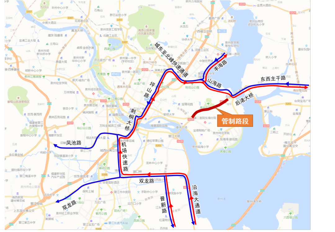 东西主干道(丰海路)--后渚大桥--山海路--城东北峰快速通道—坪山路--江滨北路--刺桐大桥--晋江(或石狮);