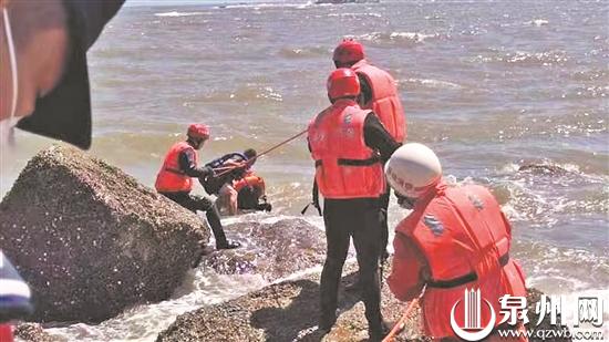 泉州网8月20日讯 (记者黄枫 陈明华 魏婧琳 通讯员辛伟彬 陈水秀 文/图)因不懂潮汐规律,男子到泉州台商投资区龟山湾游玩时,被困礁石上。危急时刻,张坂派出所巡特警中队、东园消防救援站、泉州台商投资区海上见义勇为工作室救援人员前往救援,及时将受困男子救回到岸上。