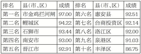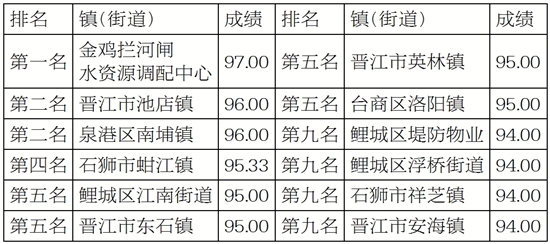 泉州网8月23日讯 (记者吴志明 通讯员邱一漫)7月份,市城市管理综合考评中心对全市海岸带(近岸海域和海岸线向陆一侧200米的陆域)和晋江河道(市区段晋江入海口至金鸡拦河闸上游100米)的环境卫生情况进行考评。其中,在各县(市、区)成绩中,市金鸡拦河闸再次取得第一名,丰泽区第十名。从各镇(街道)成绩来看,市金鸡拦河闸水资源调配中心第一名,鲤城区堤防物业、鲤城区浮桥街道、石狮市祥芝镇、晋江市安海镇并列第九名。(具体成绩详见下图)