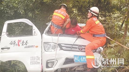 无独有偶,8月19日14时许,位于永春县苏坑镇工业区往美岭矿业路段发生一起交通事故,有一人被困。消防人员赶到后,看到事故现场一辆水泥罐车撞在右侧山体上,驾驶员已自行脱困,另一辆小货车因受到撞击导致车辆挂在悬崖边,驾驶室变形,驾驶员被困。因车辆悬空,救援难度大,两名消防人员佩戴好保护绳,利用车载牵引绳牵引,保证车辆不发生下滑的同时,扩大车头救援空间。随后,一名消防员进入车内将被困驾驶员的脚一点点拉出,被困人员成功脱险。