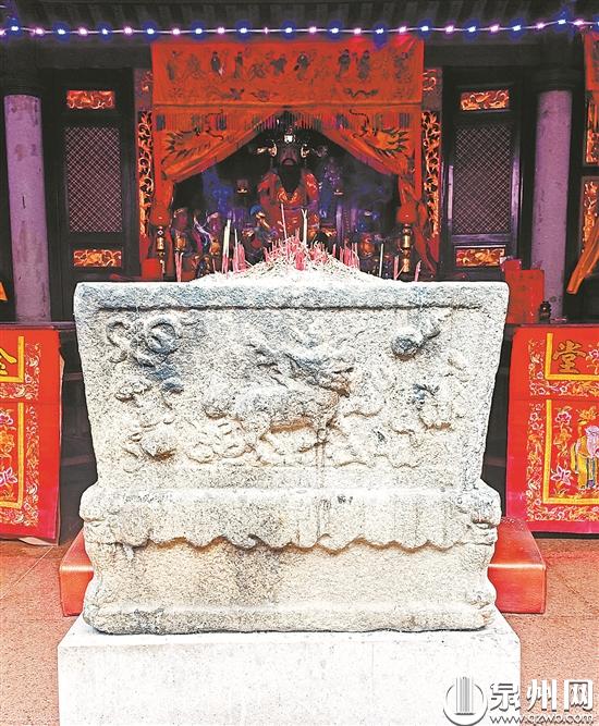 据潘山人吴文伟介绍,潘山威惠庙原址位于潘山天公山之麓,始建于唐代,祭祀“开漳圣王”陈元光。古时潘山威惠庙坐南朝北,背靠潘山市“狮舌穴”。庙分前中后三殿,东西两侧有庑廊,庙前还有大池塘。1921年因修建泉永公路,路直穿前殿和中殿,庙宇遭破坏,神像移于后殿。上世纪60年代,庙圮。1995年,邑人集资择今址重建了威惠庙。“庙内最古老的当属这石香炉了,据说是数百年前之遗物。”吴文伟指着主殿前一个方形石质大香炉说道。泉州文博研究员陈鹏鹏在仔细端详这方形大香炉后发现,侧壁上刻有“宫下许弟子,喜舍金炉,岁次丁卯年二月□日立”字样。陈鹏鹏表示,这大香炉古色古香,应为明代之物,极具文物价值,可惜从铭文无法获知其诞生的具体年代,仍待做进一步考证。