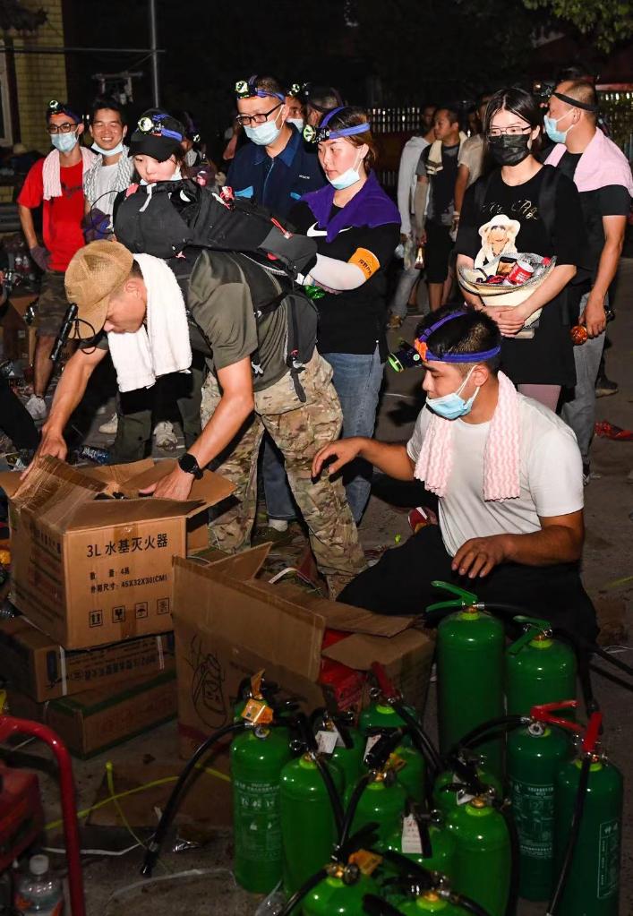 山火灭火救援志愿者在整理灭火器材。新华社记者 王全超 摄