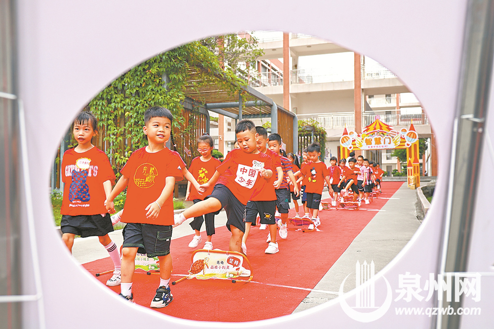 晋江第四实验小学新生入学,穿过智慧门,跨越品格栏,恭行入学礼,开启不一样的新学期。(吴志明 黄蓉蓉 摄)