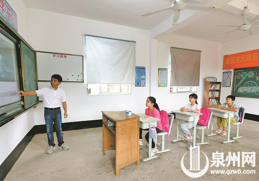 洪明春是南安路荇小学唯一的老师,三十年如一日扎根山村教育。从去年秋季起,因大部分孩子到父母工作所在地读书,该校学生数锐减到3人,但他仍选择坚守。昨日是新学期开学第一天,他为这三名五年级的学生开展安全教育课。(魏晓芳 郭芳蓉 摄)
