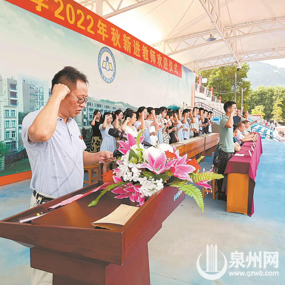 “我是光荣的梧桐中学老师,面对国旗我庄严宣誓……”安溪县梧桐中学42名新来的老师在学校苏副校长的带领下庄严宣誓。此前该校还举行了新教师培训及拜师仪式,新老教师结对,让新老师尽快融入学校。(吴志明 李四海 摄)