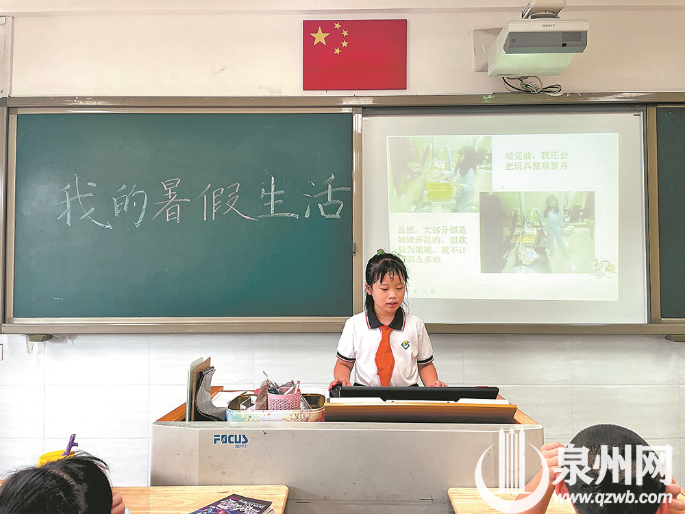 泉州市晋光小学的学生在开学第一课与同学分享“我的暑假生活”。(学校供图)