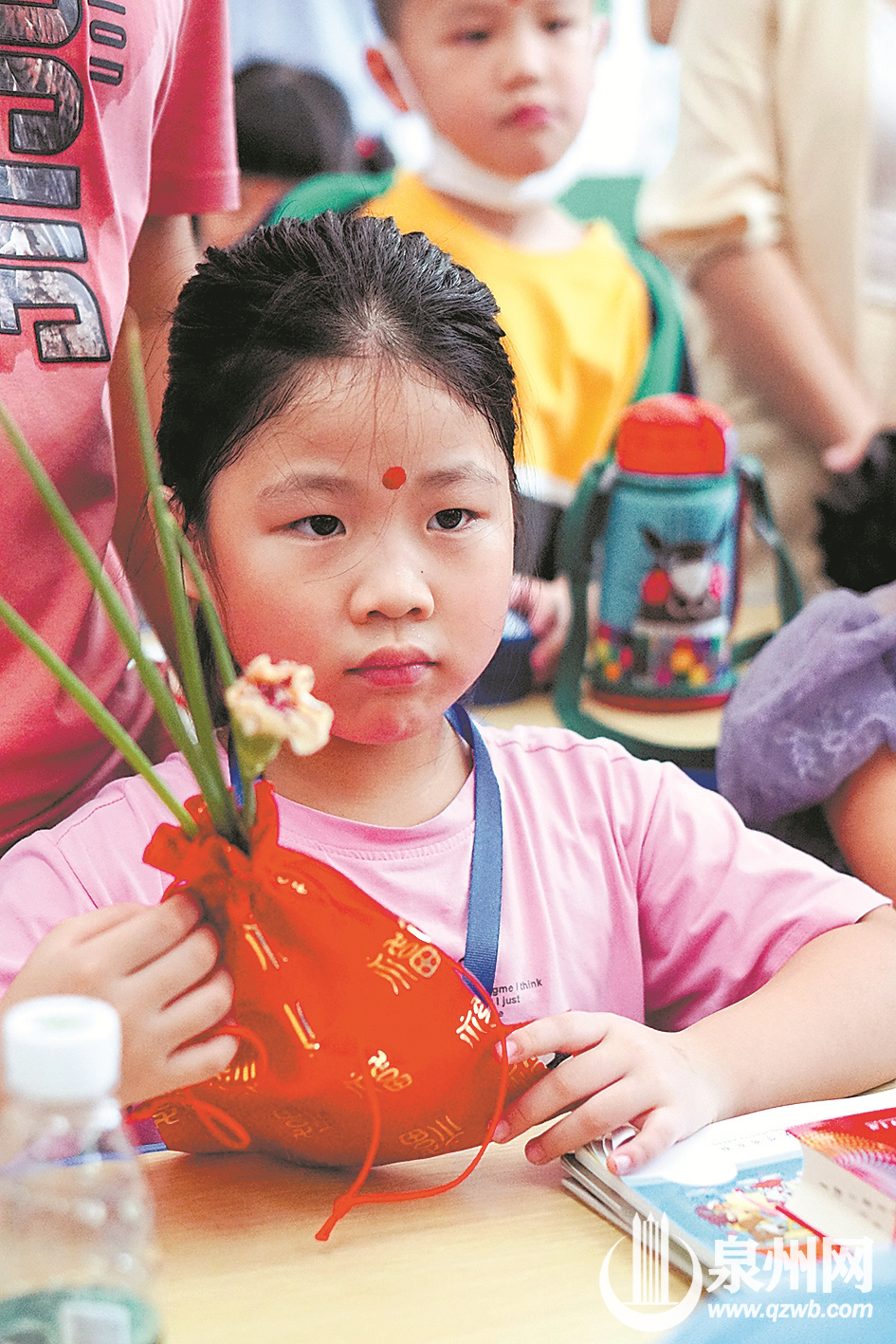 南安柳城小学为孩子们准备了新学期的第一份礼物“福袋”,里面装着一棵葱、一个菱角、一支铅笔、一朵花,寓意“聪明伶俐,妙笔生花”。(学校供图)