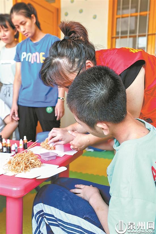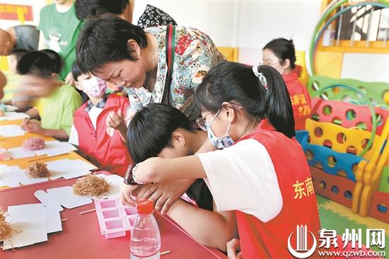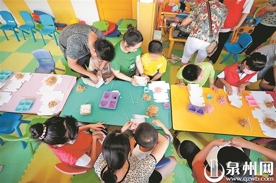 8月31日下午,东南公益理事、剪纸手艺人周婷婷老师带领10多名就读小学二年级到六年级的小志愿者来到市区的泉州爱星儿童启能康复中心,与“星孩”们大手牵小手,一起制作艾草精油手工皂。