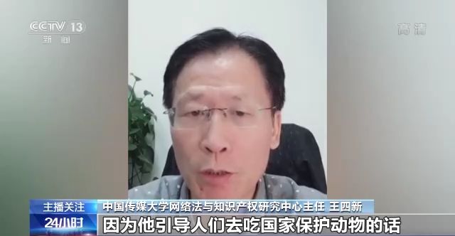 中国传媒大学网络法与知识产权研究中心主任 王四新:因为他引导人们去吃国家保护动物的话,势必会导致国家保护动物遭受更多人的捕猎,遭受更多濒临灭绝的危险,也会诱导人们形成不正确的吃东西的方式。