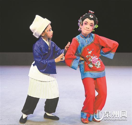 “我们表演的角色是女丑和破衫丑。”泉州市实验小学的杨楚霁、李俊圻两个小演员通过诙谐风趣、生动形象的肢体动作和抑扬顿挫、韵味十足的唱腔道白,栩栩如生、惟妙惟肖地刻画出高甲戏《骑驴探亲》中洪亲姆和洪亲翁幽默风趣的人物性格、浓郁的乡间气息,给人留下深刻的印象。两位主演经过多年的训练,基本功扎实,在剧目中的一招一式、一颦一笑都很有专业演员的架势。泉州市实验小学与泉州市高甲戏传承中心强强联手,开展高雅艺术进校园系列活动——“戏曲进校园”,打造学校“红领巾”高甲戏社团,既传承优秀的戏曲文化,又凸显“实验进取”锐意创新的风采。
