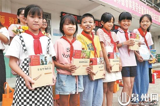 “哇,这么多新书!”当天上午,当下课铃声响起,孩子们跑出教室时,惊喜地看到操场上已摆放好了一摞摞新书。这是东南公益协会提前为学生们准备的新学期礼物,有《中国文学经典名著》《十万个为什么》《少年读史记》等上百册小学生必读书目,充实学校图书角。