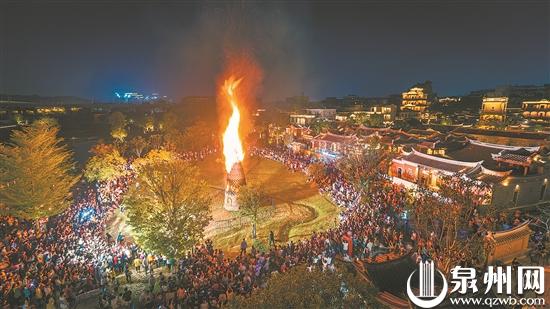 10日,在晋江梧林传统村落,“烧塔仔”传统民俗火热上演,吸引不少游客围观。