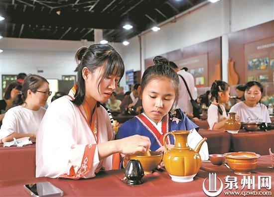 游客穿戴着宋朝服饰,行走在金交椅山窑考古遗址公园间,仿佛走进了宋元泉州磁灶窑的鼎盛时期,看着熊熊窑火烧成的精美陶瓷出窑、装船、外销。走进“磁灶窑:宋元泉州外销陶瓷生产基地”主题展馆,听讲解员讲述磁灶窑1500多年的发展历程和海丝情缘。用磁灶窑生产的传统执壶、盏、碗、杯、碟等,体验宋代点茶,感受中国瓷茶文化,历史和现实交织贯穿始终。来自省外的游客朱燕表示,这场沉浸式的活动很特别、很有意义,大家在玩乐中学习到了许多传统文化知识。