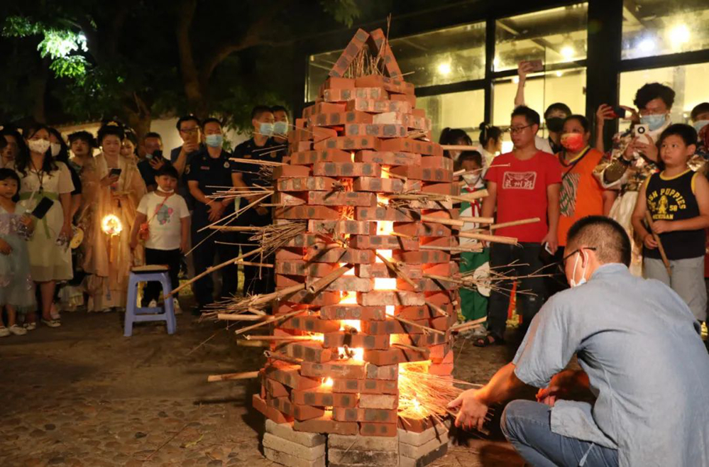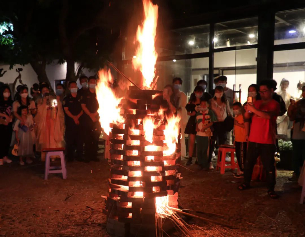 现场还举行了制作花灯、送“福”扇、猜灯谜等中秋民俗活动,而“烧塔仔”作为闽南地区特有的中秋民俗活动,寓意“生活像塔仔里的火焰一样红红火火”,当“烧塔仔”点燃时,现场爆发出一阵欢呼,大家围着篝火,共同祈愿平平安安,红红火火。