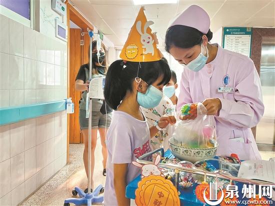 在泉州市第一医院东街院区儿科病房,医护人员为因病没办法回家过节的患儿及家属组织了一场中秋月圆“童欢乐”的主题活动。好玩有趣的游园活动,如找诗词提灯笼、玉兔拔萝卜、玉兔吃月饼、中秋主题涂涂乐、做手工中秋帽……让小患儿乐在其中。针对不能走出病房的特殊儿童,护士将快乐带进病房,邀请孩子们朗诵与中秋节有关的古诗词,让孩子们感受中国传统文化。小患者过节,医院对成年患者也有安排。在该院城东院区泌尿外科,该科室在住院大厅组织了科普宣讲及猜灯谜、博饼等活动,吸引了许多医护人员及患者参与。