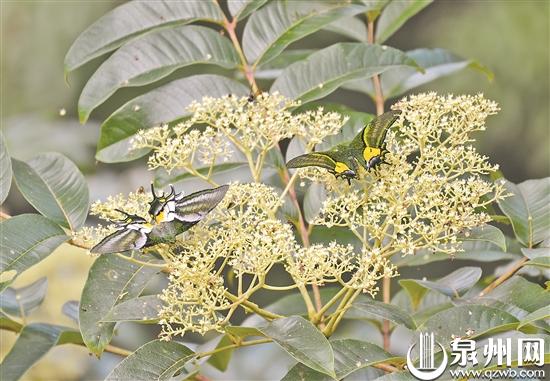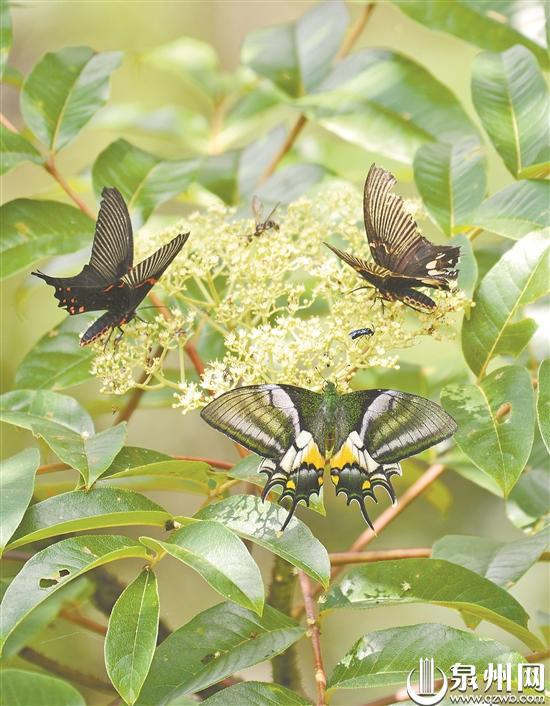 泉州网9月15日讯(记者 陈明华 通讯员 黄雅琼 文/图)“第一次拍到雌雄同框,第一次拍到4只同框,第一次同时观察到7只金斑喙凤蝶!”福建戴云山国家级自然保护区管理局(以下简称“保护区管理局”)工作人员兴奋地告诉记者,这段时间,他们在保护区内追踪调查国家一级重点保护野生动物金斑喙凤蝶,目前已确认几处金斑喙凤蝶重要的繁殖地,并记录到珍贵的雌、雄蝶生态行为与习性,多次创下全国首次记录,惊喜连连。