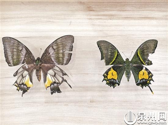 金斑喙凤蝶标本,左为雌蝶,右为雄蝶。