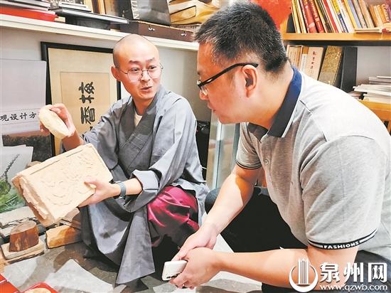 住持宗净(左)正向泉州晚报记者介绍寺内遗存的古物