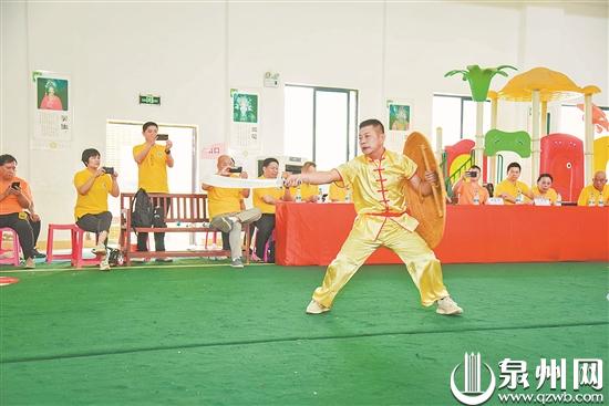 9月16日,郑成功故里“喜迎二十大 同心话融合”中华传统武术交流活动在南安石井举行,50多位泉州与港澳台地区武术爱好者齐聚一堂,以武会友。图为盾牌刀表演。
