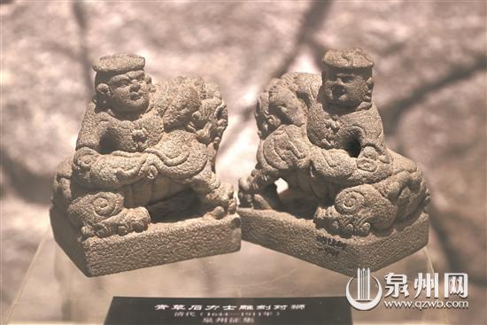 明代德化窑白釉狮形插器、清金漆狮形木构件、民国泥塑脊兽对狮、清代木雕戏狮狮座、清代青草石力士雕刻对狮……泉州市博物馆的多个展厅里还有数十件“狮”主题藏品,它们形态各异、功能不同、材质不一。