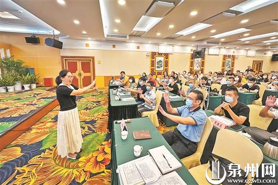 23日,泉州市残联举办全市乡镇(街道)残疾人联络员培训班,组织乡镇(街道)残疾人联络员集中学习扶残助残政策、残疾人家庭无障碍改造经验、通用手语、残疾人心理沟通技巧等,进一步提高服务残疾人的质量和水平。图为泉州市特殊教育学校老师教授残疾人联络员常用手语,方便联络员拉近与听障服务对象的距离。(陈凌鹭 陈晓东 摄)