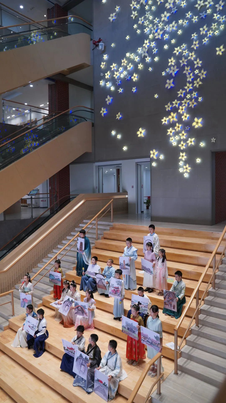 首先,在丰泽区图书馆一楼“素馨花开”文化墙前的阶梯,一场别开生面的泉州二十二史迹诵读音乐快闪活动美妙开场。20余名小朋友手持泉州世遗景点画作,在悠扬的音乐中声情并茂地朗诵陈继红老师所作的22首世遗泉州诗词作品。