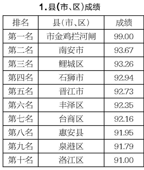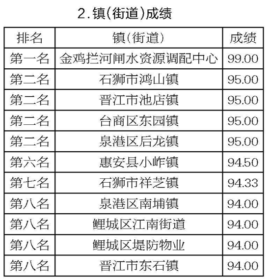 泉州网9月27日讯 (记者吴志明 通讯员邱一漫)8月份,市城市管理综合考评中心对全市海岸带(近岸海域和海岸线向陆一侧200米的陆域)和晋江河道(市区段晋江入海口至金鸡拦河闸上游100米)的环境卫生情况进行考评。在各县(市、区)成绩中,市金鸡拦河闸再次取得第一名,洛江区第十名。而从各镇(街道)成绩来看,金鸡拦河闸水资源调配中心第一名,泉港区南埔镇、鲤城区江南街道、鲤城区堤防物业、晋江市东石镇并列第八名。 (具体成绩详见图)
