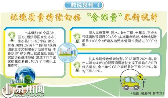 党的十八大以来,在习近平生态文明思想的指引下,作为全省经济大市的泉州,把坚持生态优先、绿色发展落实到行动中,生态环境质量持续向好。2015年11月7日,泉州成为全省第二个通过国家生态市考核验收的设区市,并于次年9月正式获得“国家生态市”命名。