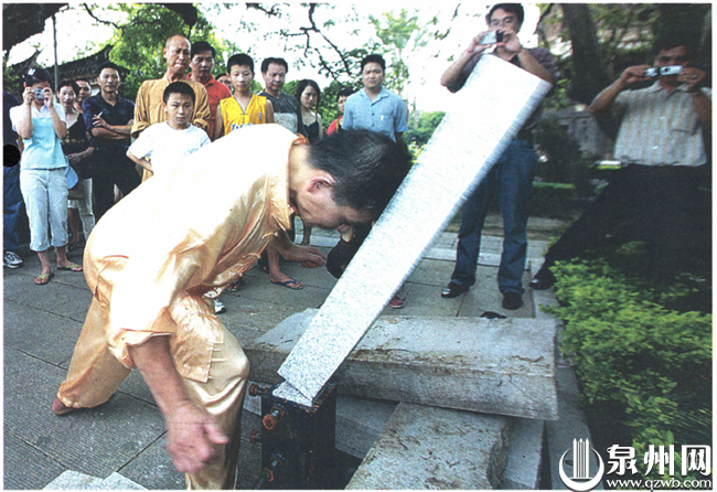 2006年8月10日,刘振宗义子林国安在开元寺西塔下表演“铁头断条石”(林国安 提供)